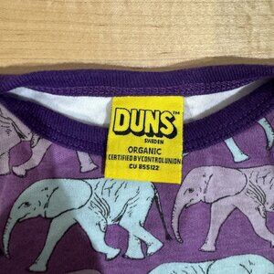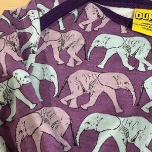 This onesie is in good condition with some light wash wear. A great bold purple with a fun elephant print. DUNS is a quality Swedish brand.