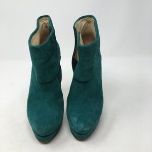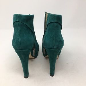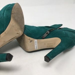 GREEN SUEDE PLATFORM HEELS SOME SCUFFING ZIPPER AT HEELS 5 IN