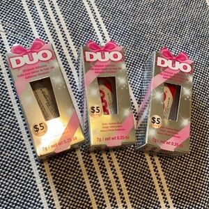 Set of 3 as pictured of DUO striplash eyelash adhesive glue. Dark eyeliner effect. Brand new unopened, each package is 7g .25oz. Questions? Leave a comment below! “4”