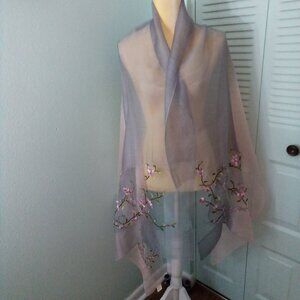 DUSTY PINK GREY OMBRE 40% SILK 60% WOOL LONG SHEER EMBROIDERED JAPANESE BLOSSOMS. 31.5" wide x 80" long. Beautiful! In like new condition.