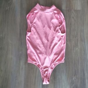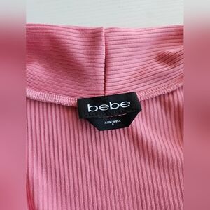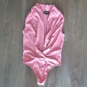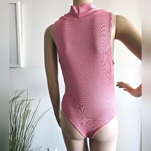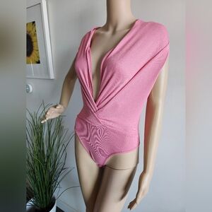 BEBE Dusty Rose Bodysuit in perfect condition, never worn! Very versatile, can be worn on or off the shoulders. Sleeveless, snap crotch closure. Twisted Deep V neck, and if you are not into that much cleavage you can add a broach to hold it higher. Ultra soft stretch ribbed cotton. Color is a lovely shade of Pale Pink in Dusty Rose, may appear brighter in the pictures because of camera.