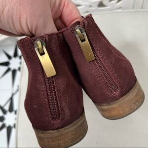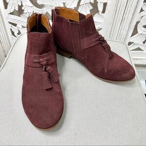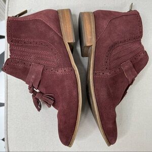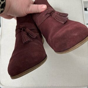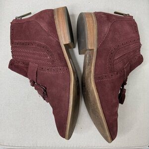 DV Burgundy Suede Tassel Ankle Boots in very good condition. Some minor wear to suede but otherwise really lovely. Little tassels are a great detail. Back zips, gold-tone hardware.