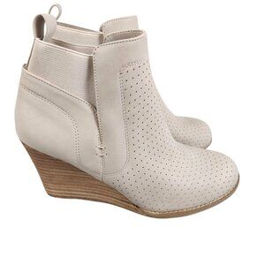 Dolce Vita boots, wedge booties, leather wrap heel, beige ankle boots, DV by Dolce Vita, perforated booties, trendy footwear, women's shoes, size 8 boots, elastic side panels, stylish booties, comfortable wedge heel, casual footwear, minimalist