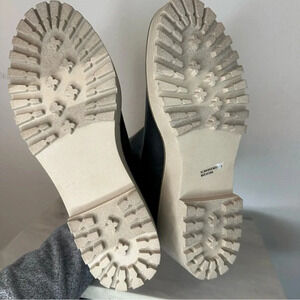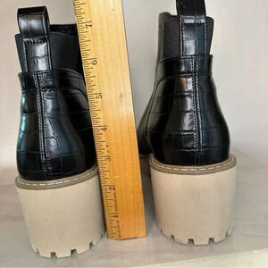 booties with a tan chunky lug platform and effortless slip-on styling, Faux-leather upper in a wedge ankle boot style with a round toe. Elastic gore. Heel tab. Soft lining with cushioned insole. Midsole with contrast stitching. Lug outsole. 2.25" wedge height, back ankle has faux crocodile print. Excellent pre owned condition