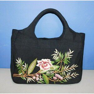 DV, DOLCE VITA BLACK FABRIC TOTE WITH EMBROIDERED FLOWERS, HANDBAG, PURSE