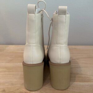 Bold combat boot sitting on a chunky platform and lug soles. Allover neutral hue. 2.75'' heel with 1'' platform Lace-up with side zip closure Memory foam cushioned footbed Man-made upper Man-made lining Man-made sole Imported
