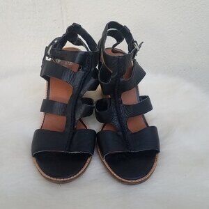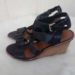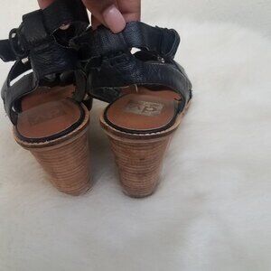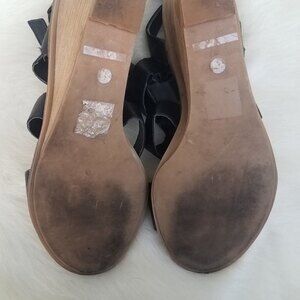 Black ankle strap wedge heels, buckle closure with approximately 3" wedge