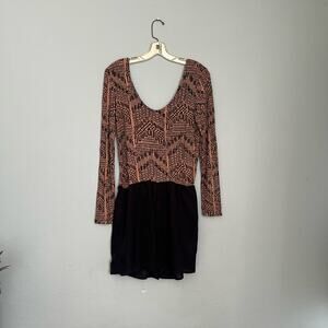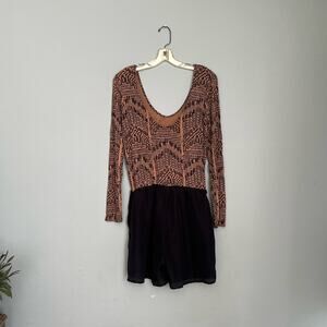 DV Dolce Vita lightweight long sleeve romper with pockets, deep plunge back and lined shorts in a black and brown aztec geometric design. Very soft and flowy. Perfect for a casual day trip or even a night out with some heels. Chic and comfort all in one.
