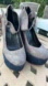 unique and rare ultra chunky ultra high platform, navy blue gray suede pumps with buckle ankle strap