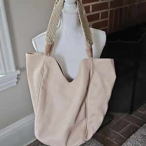DV stunningl vegan leather cream tote bag has a snap closure, braided shoulder straps, zippered inside pocket, two open inside pockets,and two front tassels. This is in great previously owned condition.