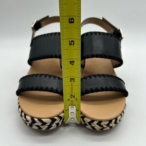 Step out in effortless style with these DV by Dolce Vita wedge sandals. Featuring wide black vegan leather straps with whipstitch detailing, an adjustable ankle buckle, and a woven espadrille-inspired platform, these sandals combine comfort and fashion.