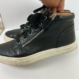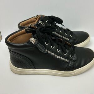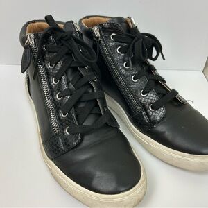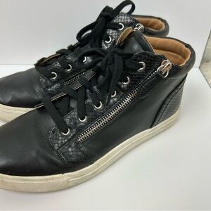 Stylish black sneakers with white sole. Features side zipper and lace-up design.