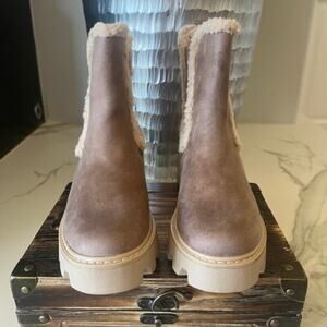These NWOB DV by Dolce Vita Cozy Platform Lug Sole Boots feature a lightweight design, pull-on styling, plush faux fur details, a round toe, a cushioned insole, memory foam, and breathable lining.