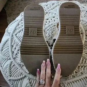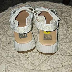 Stylish cream sandals with textured straps. Features a platform sole. Perfect for casual wear.