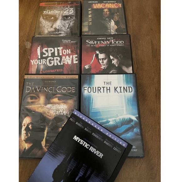 7 DVDs: The Number 23, Vacancy, I Spit On Your Grave Unrated, Sweeney Todd, The Davinci Code, The Fourth Kind, Mystic River