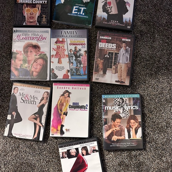 Assorted DVD movie collection featuring various genres and titles. DVDs are in good condition. Cases are faded from sunlight