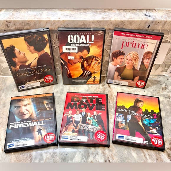 Set of 6 assorted pre-owned hit movie DVDs in black standard cases. Includes recognizable titles for casual home entertainment: