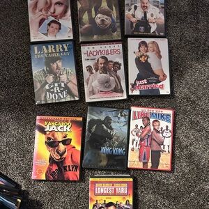 Collection of various DVD movies. Includes comedy, action, and family genres. Perfect for movie nights. DVDs are in good condition. Cases are faded from sunlight
