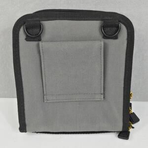 The gray and black trimmed case has one large zippered pocket, belt loop and a strap handle at the top for easy carrying. The main zippered storage pocket holds 24 DVD's or CD's.