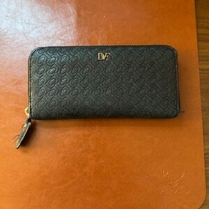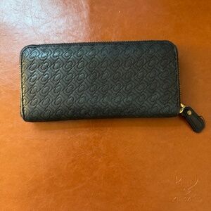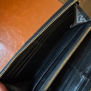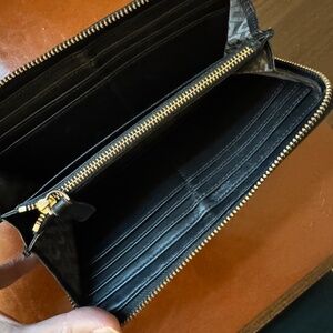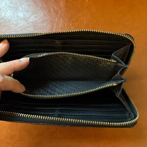 Black wallet with gold zipper. Used and loved, but still in good condition.