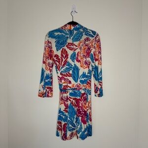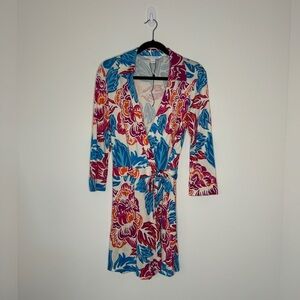 A floral DVF romper in a signature wrap design. A fold-over collar frames the crossover V neckline, and a self-belt ties at the side. Snap cuffs and 3/4 sleeves.