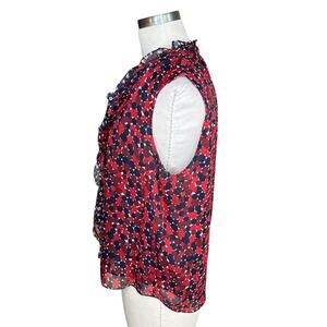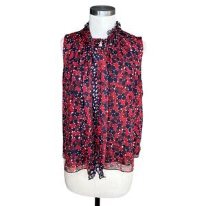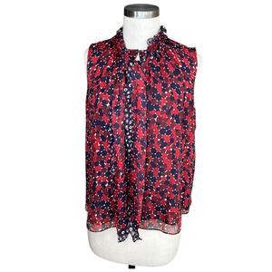 Women's blue and red pattered Fernanda silk sleeveless blouse from Diane Von Furstenberg in size medium. Tiny pull on the front and minor wear under the arms as shown, otherwise great used condition.