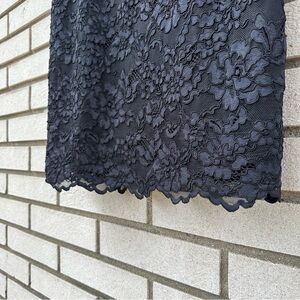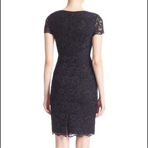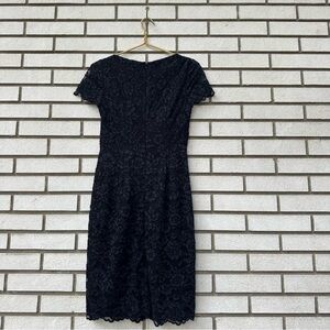 A curve-hugging fit and graceful bateau neckline converge to make this delicate lace sheath a fetching date night option. Side zip closure. Bateau neck. Cap sleeves. Back vent. Stretch lining. 41% nylon, 35% cotton, 24% rayon. Sheath silhouette. Scalloped hem. Hidden back zip. Polyester lining. Size 2. Great used condition, small deodorant mark in armpits.