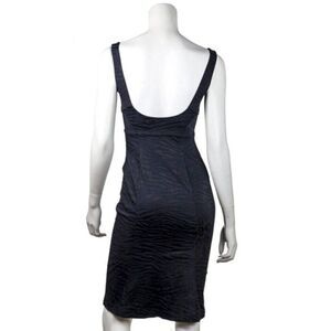 A bodycon dress is a woman's secret weapon with its supreme versatility and form-flattering silhouette. This Diane von Furstenberg Bridget dress stands out with its subtle black and navy zebra print pattern. The scoop neckline and low back expertly accentuate the female figure.