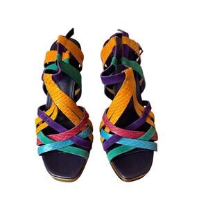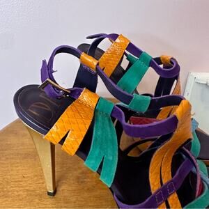 Great used condition. Very light wear on soles. Ankle straps with buckles. Beautiful jewel tones throughout. Metallic gold platform and heels.
