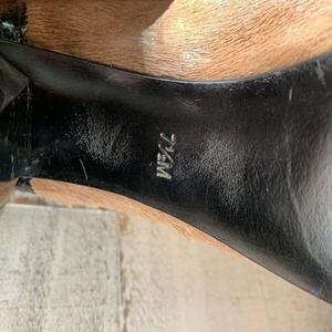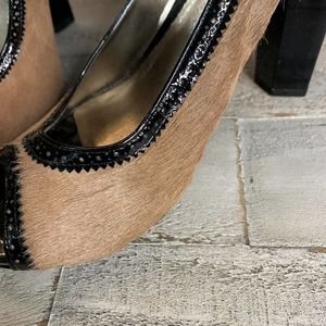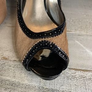 DVF Diane Von Furstenberg Pony Hair Peep Toe Heels Size 7.5 Pumps Black Patent.