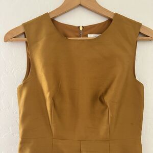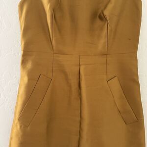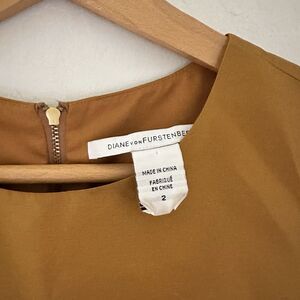DVF Diane Von Furstenberg Silk Blend Hazelnut yellow gold color. Dress Size 2 Carpreena Mini Sleeveless. Full zip back. Two front pockets. Condition is Pre-owned - Good. A couple faint spots at hem of dress, see pic. Lines in fabric are normal for silk material.