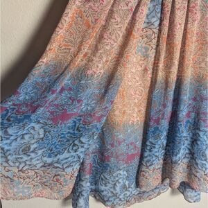 100% silk in a sheer flowy texture with an interesting pattern in pink & blue shades. Flutter sleeves with pleated details and flowy flyaways panels down the front and back. Lined in stretch silk. This is the perfect soft look for casual outings or resort wear. Measures 36" long, 19" flat across the bust and hips.