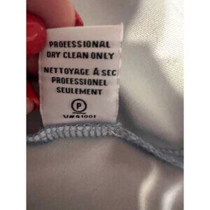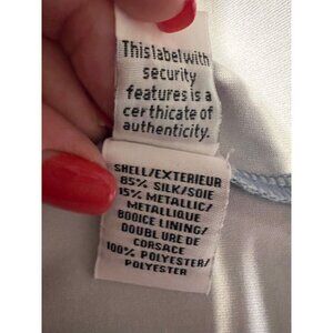 Made of 85% silk and 15% metallic. Polyester lining.  Classic wrap style with attached fabric tie belt.  Measurements are a guide as a wrap dress will "give" some.