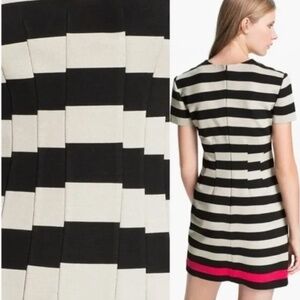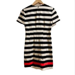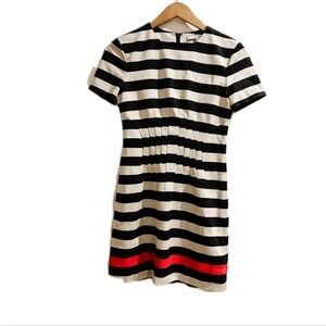 Striped stretch jersey dress. Fitted. Attached slip with added lace to add length and style. Classic and stunning. Red, black, and beige striped.