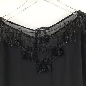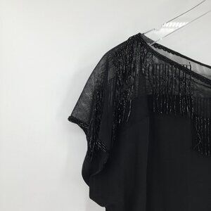 Cap-sleeved shift dress with mesh along the neckline and beaded fringe trim that reminds me of a 20's flapper dress
