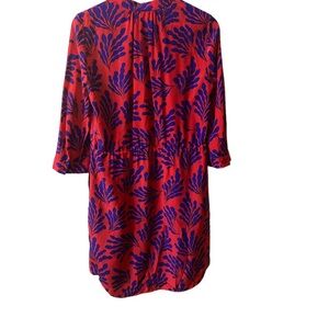 Vibrant red and blue dress by Diane von Furstenberg. Features a bold pattern and elegant design.