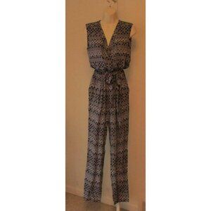 Sleeveless jumpsuit in lightweight silk navy and white geometric fabric with a faux-wrap neckline.