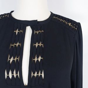 This silk dress features beaded, knotted straps at the cutout details. 2-button closure at neck and keyhole at bust. Ruching at back and at single-button cuffs. Long sleeves.