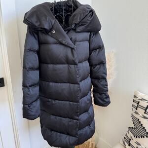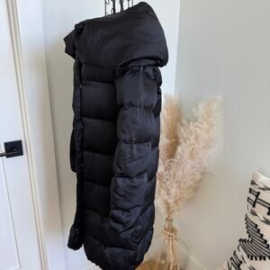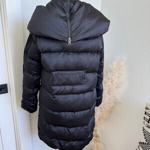 This luxurious coat features a sleek black satin finish and is filled with cozy goose down for ultimate warmth.