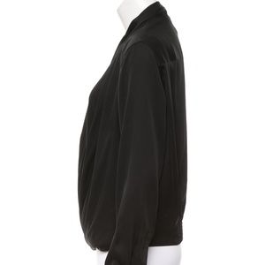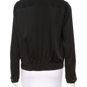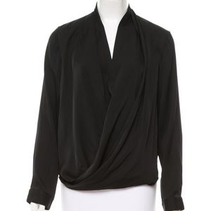 Black Diane von Furstenberg Issie silk top with long sleeves and draping at front.