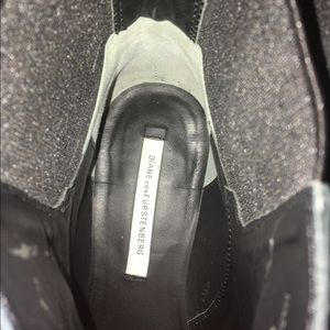 Diane von Furstenberg flat heel booties, size 9.5. Golden hardware embellishments around ankle, elastic gore for ease of dress. Purchased at a sale a few months ago, worn maybe 5 times.