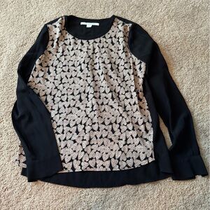 Beautiful blouse from designer, DVF. Mixture of black and tan heart print with all black sleeves. Great quality and condition