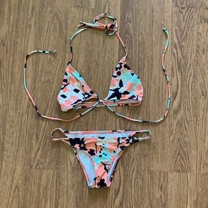 Crossover bikini top and binded surfer bottoms. Used once, mint condition. As seen on Goldfish Kiss. Roxy collaboration with Diane Von Furstenberg.