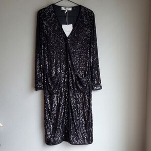 Cut from glamorous sequined jersey, this faux-wrap dress buttons up the front, has two front pockets. Let yours flow openly as a duster, wear it as a dress or style it half buttoned with pants for your upcoming event.