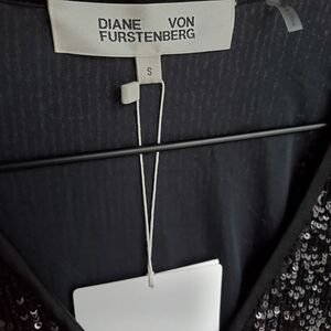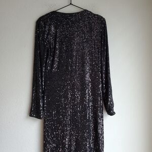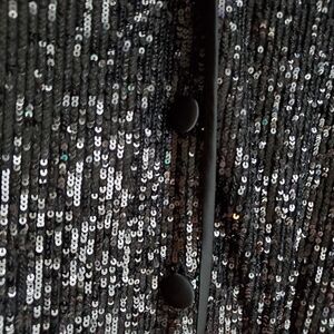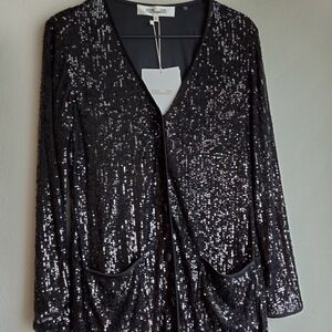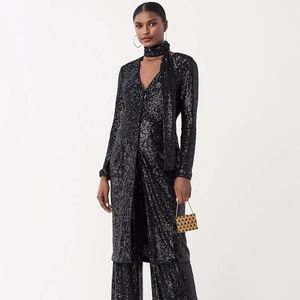 Cut from glamorous sequined jersey, this faux-wrap dress buttons up the front, has two front pockets. Let yours flow openly as a duster, wear it as a dress or style it half buttoned with pants for your upcoming event.