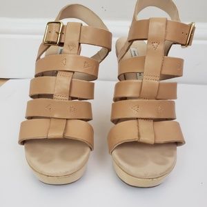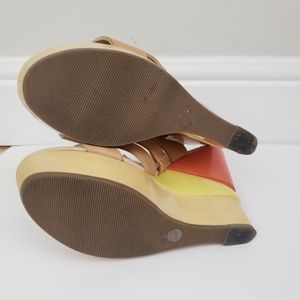 DVF Citus Wood and Leather Wedge Platform Sandals . Insanely cute, sexy and fun platform wedges from the queen of color Diane Von Furstenberg . The wedge is made up of overlapping stacked stained wood layers in natural, yellow and blood orange. The soft tan leather straps are wide and strudy to keep you sure on your feet and comfortable at such hreat heights. Side buckle closure. EUC. Minor scuffs to back of heel & slight ding in the wood that is only noticeable up close. See pics. 5” heels.