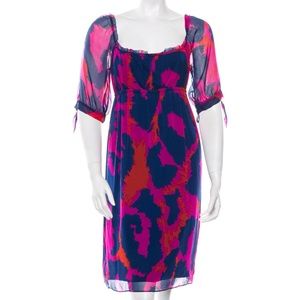 Fuchsia, classic blue and tangerine Diane von Furstenberg three-quarter sleeve silk dress with raw edge bateau neck, cinched waist and flounce hem.
