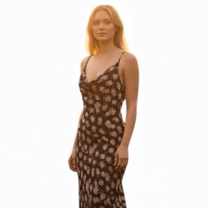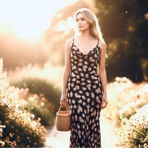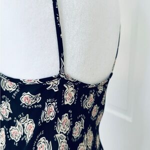 Elegant Diane Von Furstenberg silk dress with floral design. Cowl neck, spaghetti straps and comes to mid-calf length on me - 5.7 ft Features black background with white/redpink details. French translation of words - ‘Love in the garden’. Romantic, delicate slip dress.