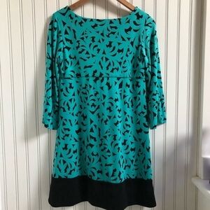 Pullover style, three quarter sleeves and a scoop neck bodice. Flattering sheath with a fantastic drape. Slight bell sleeves.