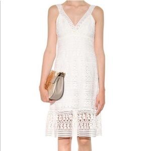 DVT Diane Von Furstenberg white lace dress with V neck and side zipper closure. Triple lined with exposed lace detailing on the bottom.